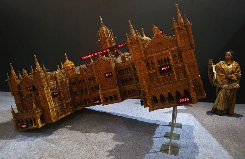 Mumbai artist T V Santhosh’s installation tilts the city’s historic railway station at an angle, with several digital clocks on its walls counting down time in the Mumbai landmark.