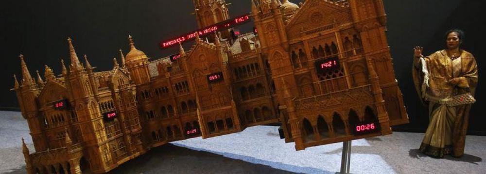 Among an array of paintings, sculpture, video installations and photographs is another wooden exhibit - one inspired by a militant assault on the city of Mumbai in 2008.