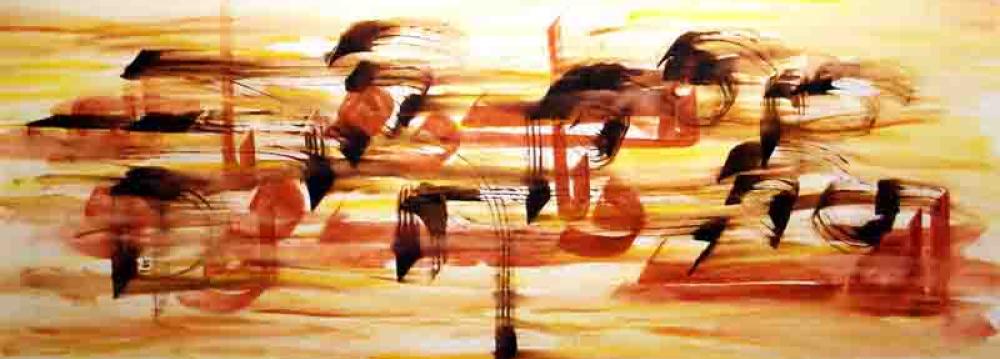 Raised in the arid city of Kerman, his combination of calligraphy – particularly Kufic (the oldest calligraphic form of the various Arabic scripts), painting, and poetry is intended as a dialogue between distinct art forms and cultures, in which visual elements display a mysterious and multifaceted world; one which reflects both his own Persian identity and contemporary, universally comprehensible artistic values.