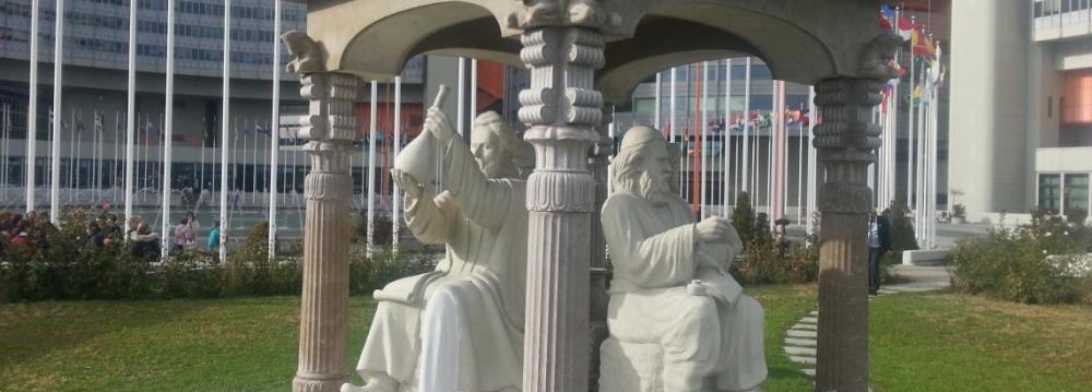 There is an old famous saying, “Art rests with Iranians only.” Over the past centuries, it was the Persians who showed the way to the world in the various skills of art. The history of Iran is also replete with names of eminent scholars in different fields of science, renowned for their major contributions to scientific development. The world has come to know them through the books they left behind as well as the works of art. For the past 18 days, the international community has been closely following the Iran nuclear talks with the P5+1 in Vienna, which finally led to a deal on Tuesday (July 14). The final agreement was announced following a plenary meeting between the two sides at the Vienna International Center, which hosts the United Nations Office in Vienna (UNOV). But along with Iranian and foreign diplomats attending the session, sculptures of four eminent scholars were prominent in the yard in front of the UNOV building, Honaronline reported. UNOV is one of the four major UN offices where several UN agencies have a joint presence. The office complex located in Vienna was established in 1980. In June 2009, Iran donated a scholar pavilion to UNOV which is placed in the central Memorial Plaza of the Vienna International Center. The ‘Persian Scholars Pavilion’ features the statues of four prominent Persian figures. Persian Art Highlighting Persian architectural features, the pavilion is adorned with Persian art forms and includes the statues of renowned Iranian scientists Avicenna, Abu Rayhan Biruni, Zakariya Razi (Rhazes) and Omar Khayyam. Abu Rayhan Birouni (973-1048), considered by some as the founder of Indology, worked in various fields such as astronomy, chemistry, geography and geology. He is believed to be the first person who said the Earth rotates. He is also known as the first Muslim scholar to study India and the Brahminical tradition. Known as a prominent alchemist, chemist, physician, philosopher and scholar, Rhazes (865-925) is widely recognized for the discovery of alcohol and sulfuric acid. He has also written numerous notes on diseases such as smallpox and chickenpox. Avicenna (980-1037) was a Persian polymath and the father of modern medicine, who influenced many literary and scientific figures including the renowned poet Omar Khayyam. His magnum opus is an immense encyclopedic work called ‘The Book of Healing’. Omar Khayyam (1048-1123), eminent Persian poet, astronomer and mathematician is best known for his collection of quatrains (four-line poems) ‘The Rubaiyat of Omar Khayyam’. ‘Rubaiyat’ is known in the West through Edward Fitzgerald’s 1859 translation. The sculptures, all on a human-size scale, are seated with each holding a symbolic object related to their fields. Avicenna holds a book, Rhazes a laboratory tube, Abu Rayhan a globe and Khayyam, a pencil and sheets of paper. Traditional Arch The stone sculptures are two-meters high and the pillars surrounding them are designed after traditional Persian architecture of the Achaemenid era and found in Persepolis, Iran. An arch is placed on the four pillars, roofing the four scholars. The whole structure is called ‘chartaghi’ in Persian and is the most famous element of Persian architecture, and because of its spiritual position in Zoroastrian temples it has maintained its prominent architectural role up to the present time. A chartaghi consists of a shelter made of four vaults that stand on four pillars. A water basin is installed right below in the center. Sunrise, in the east, sunset in the west and the moment when the sun is at its zenith, the highest position at noon in the south, inspired Iranians to design the chartaghi as a cross (the most famous Iranian symbol for the four geographical directions), and to install a small opening in its ceiling to allow sunlight to light it up. A thrilling moment that everybody wished to watch was the reflection of sunlight in the water basin located in the center: it resembled the struggle of light and darkness that finally ended in the triumph of light. These ancient Persian ritualistic concepts maintained their importance in the Islamic period as well. Given the cultural background, the ‘Scholars Pavilion’ has been built on the same characteristics. Its dimensions are 2.2m x 2.2m x 3m, and is made of stones and fiber stones. It represents an Iranian national and ritualistic symbol. Each pillar comprises a pedestal, pillar and a bull-guard capital which supports the ziggurat ceiling with 14 battlements decorated in each direction. The ceiling facade is ornamented with sun icon decorations (a sun with 12 sun rays). In each arch one of the glories of the Iranian scientific figures is presented. Indeed, these four great Iranian scientists dispersed their knowledge in all four directions to the entire world.
