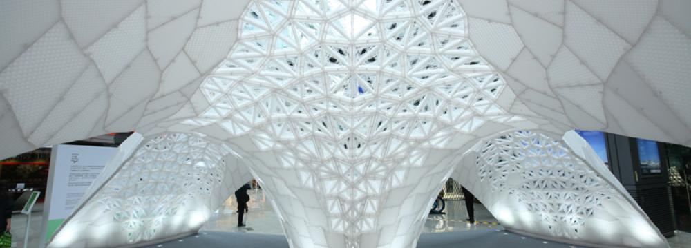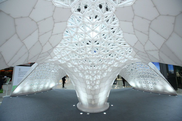 A total of 1,086 different 3D-printed constructive units comprise the eight-meter-long, three-meter-tall structure. It can be subdivided into three identical modules, thus making it flexible to fit the requirements of the exhibition site and activity area.