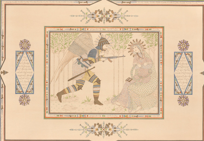 “The hand-written poems lend rhythm and symbolism to the visual syntheses that I present within elaborate borders and in the style of Persian Safavid miniature.”