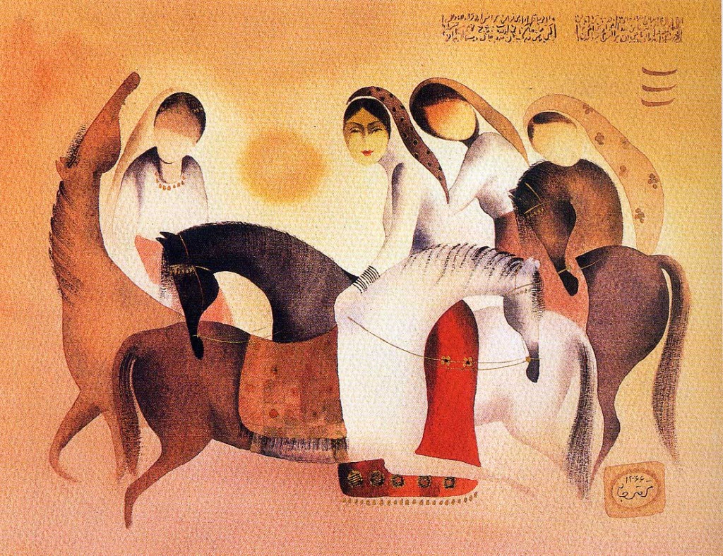 In describing his paintings Taraghijah once said: “The horses in my paintings ride free of the earth, as do the roosters, human forms and mountains. This symbolizes their constant thoughts of their origins, paradise, where there is peace, harmony and love. Their desire is to fly and to return home to loved ones. The color white in my paintings symbolizes God. We feel his presence close to us everywhere.”