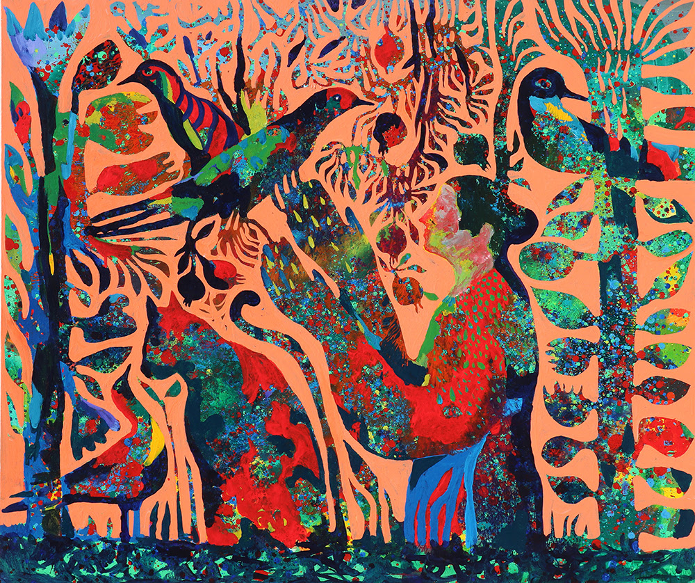 The other exhibit at the gallery are artworks by Reza Hedayat, 51, who, with an abundance of colors, has created a colorful realm of animals, birds and humans that conveys a sense of peace and tranquility.