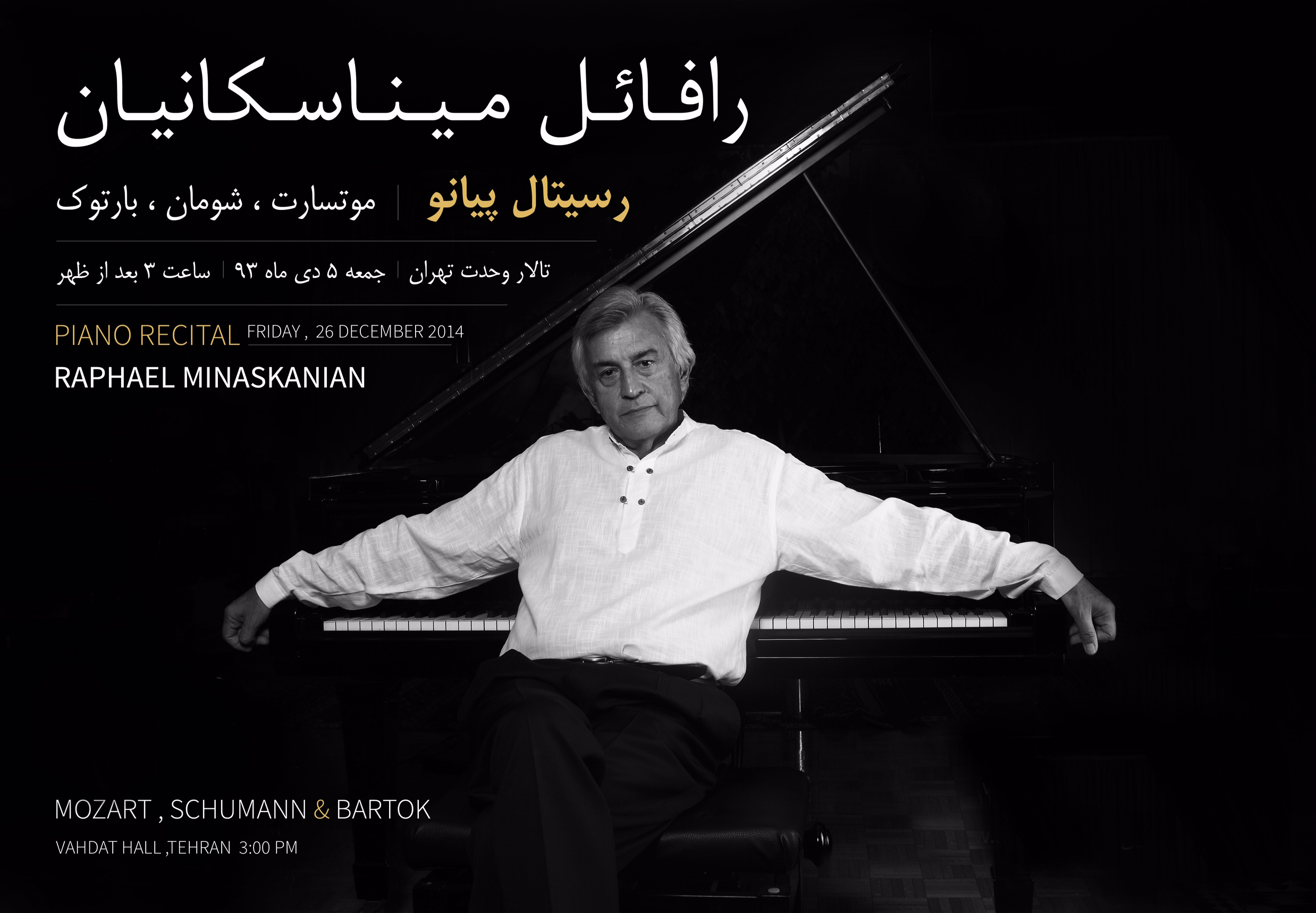 Raphael Minaskanian, an internationally acclaimed artist and eminent Iranian classical pianist and professor of music will render a piano recital on December 26 at the Vahdat Hall.