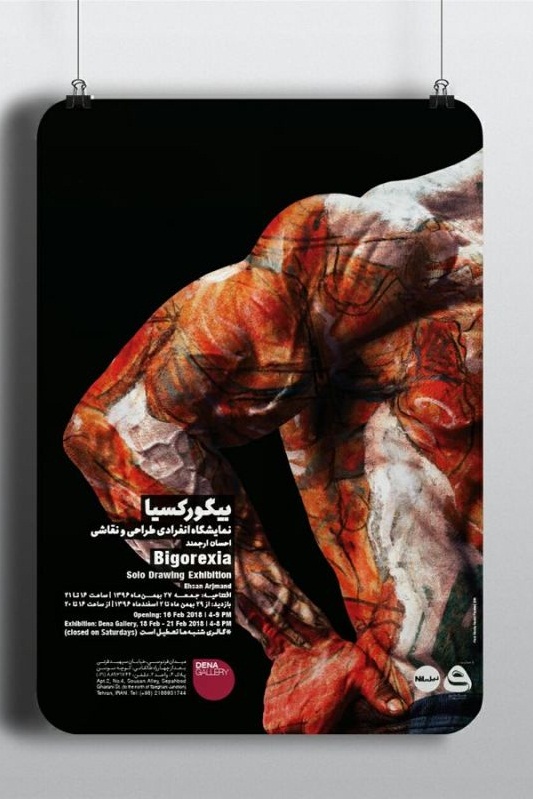 Young sculptor, painter, sketch artist and character designer Ehsan Arjmand has put on display a series of paintings and drawings at a solo exhibition titled ‘Bigorexia.’