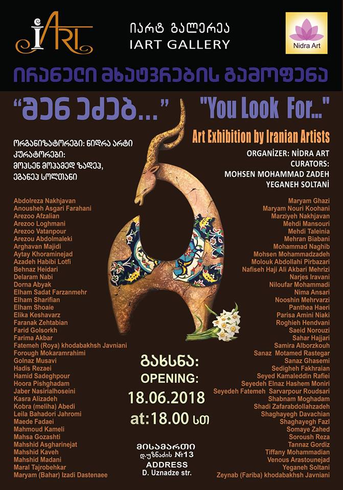 IArt Gallery in the Georgian capital is hosting an exhibition of paintings by Iranian artists, June 18-24. Titled “You Look For”, the event is showing 60 paintings by 30 artists on diverse subjects and with the use of assorted techniques, IRNA reported on its Persian website. Nima Ansari, Mohsen Mohammadzadeh, Maryam Ghazi, Golnaz Mousavi, Elika Keshavarz, Kasra Alizadeh, Delaram Nabi, Behnaz Heidari and Soroush Reza are among the artists whose works are on display in Tbilisi.