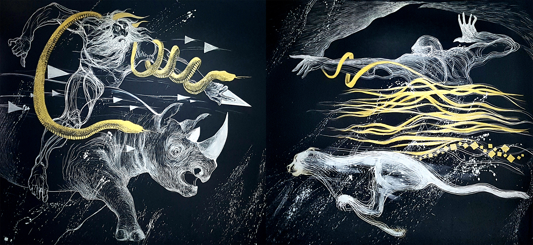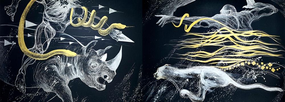 Among the 23 large-scale works on display there is “The Battle of Fereydoun and Zahak”, which pits good against evil, inspired by one of the many stories of Shahnameh (Book of Kings), the 11th century long epic poem by the accomplished Persian poet Abolqasem Ferdowsi. The piece, like other presented works has been created with a silver marker on black canvas.