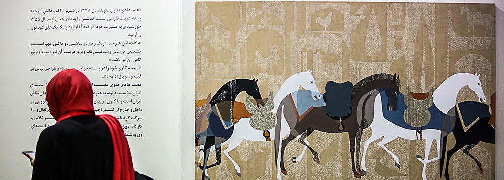 To give his work a more Persian tinge, Fadavi has employed, in the background, colors usually used in Persian carpets, like Persian indigo and Persian red (also called artificial vermillion).