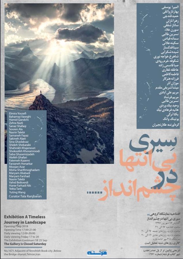 Painter and curator Tala Ranjbaran has collected the works. Participating painters include Roshanak Nouri, Vahid Beikverdi, Sanaz Shafaqi, Shahrokh Khajeh-Nouri and Yasin Kazemi. Landscape painting is the depiction of natural scenery such as mountains, valleys, trees, rivers, and forests, especially where the main subject is a wide view, with its elements arranged into a coherent composition.