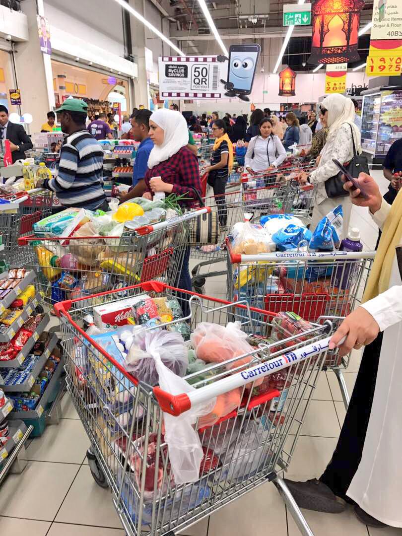 Trucks carrying food to Qatar were reportedly lining up across the border on Monday, as its residents began swarming grocery stores. Qatari media reported that some stores had begun seeing their shelves empty over fears that the crisis could see groceries run out of products.
