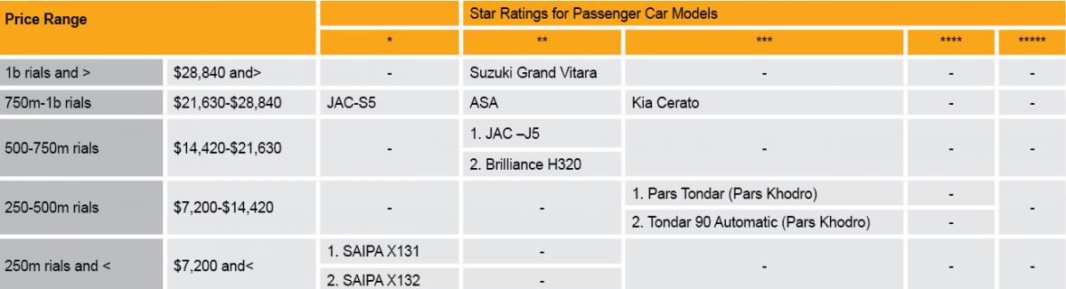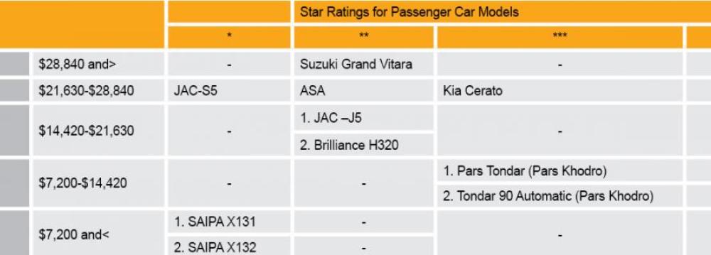 According to Qanati, the latest data show 19 vehicles received a single-star rating, 10 models have fallen under the two-star rating and five models held three stars. No cars were ranked higher, leaving the four and five star rating class empty.