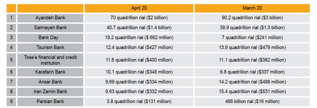Nine other commercial banks which were excluded from the table hold 1-2 quadrillion rials ($34-68 million) in debt to the CBI and development funds.