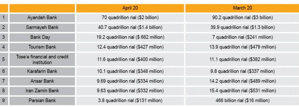 Ayandeh Bank stands at first place among debtors but it managed to decrease the debt by 22% within a month. However, Sarmayeh Bank has failed to do so. Despite taking massive loans, Bank Day is exempt from paying 34% interest to the central bank since it mostly borrowed from other banks and domestic financial institutions.