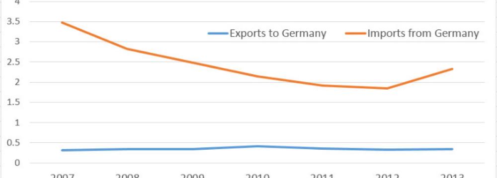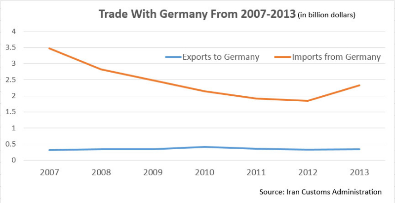 Iran-Germany trade between 2008-14 stood at $18.8 billion (about $2.7 billion per year on average). During the period, Iran’s imports from Germany amounted to $16.4 billion as exports to the country hit $2.4 billion.