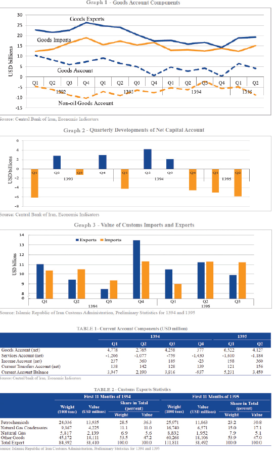 Non-oil exports decreased by 1.6% in value and non-oil imports increased by 7.6% in 1395H1, reaching $13.3 billion and $26.9 billion, respectively. Accordingly, the non- oil trade deficit reached $13.5 billion, showing an 18.4% rise in that period. Graph 1 depicts the goods account components from 1392Q1 to 1395Q2.