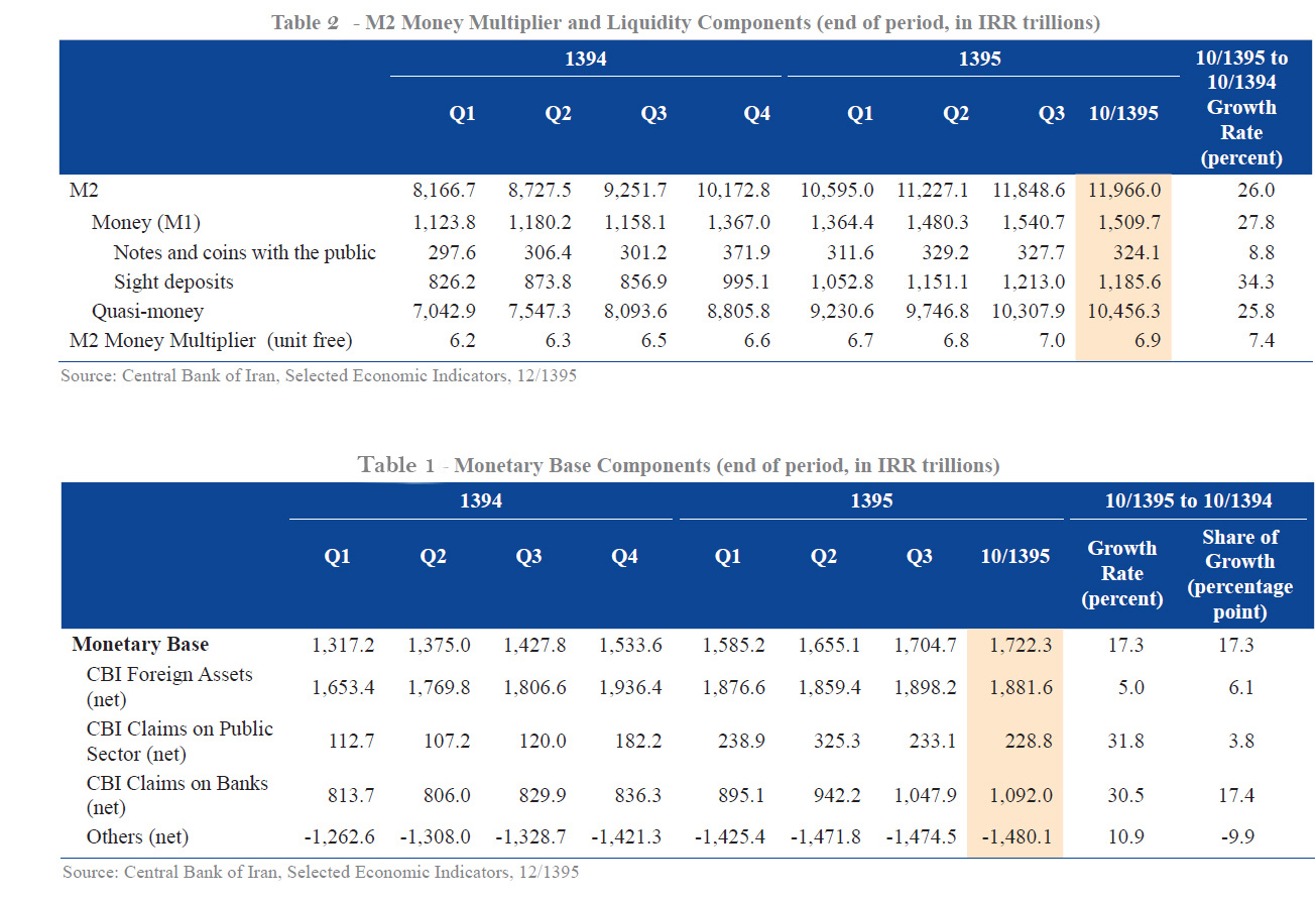 The liquidity (M2) rose by 26.0% by Jan. 19, 2017, and reached 11,966.0 trillion rials, helped by the rise in monetary base and M2 money multiplier. Among liquidity components, money (M1) and quasi-money grew by 27.8% and 25.8%, respectively, accounting for 3.5 and 22.6 percentage points of the liquidity growth.