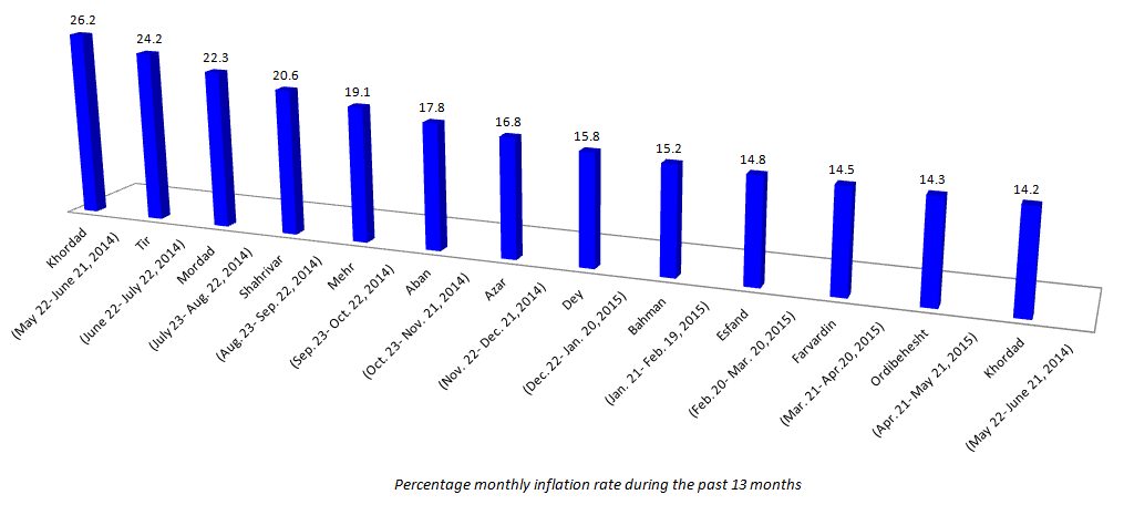 The inflation rate is the lowest since the new administration led by President Hassan Rouhani assumed office (in August 2013) and nearly half the value in the similar month last year when a 26.2% inflation rate was recorded.