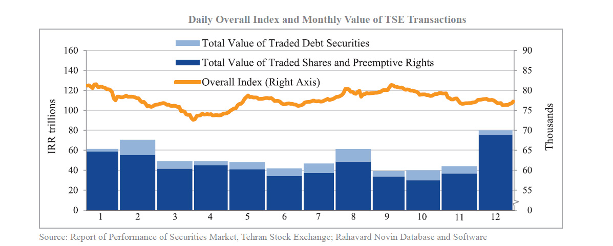 As shown in the following graph, after surpassing 80,000 at the end of fall, the overall index dropped from the beginning of winter and fluctuated between 76,000 and 79,000 in the last two months of the year. The value of transactions at TSE was higher in winter than in fall and peaked in the last month of winter. However, the value of traded debt securities dropped in winter.