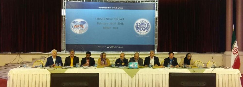The World Federation of Trade Unions’ Presidential Council convened in Tehran on Feb. 26-27, during which international and regional labor issues were discussed and WFTU goals and priorities were defined for 2018. The council was attended by WFTU General Secretary George Mavrikos, Iran’s Minister of Cooperatives, Labor and Social Welfare Ali Rabiei as well as a host of other Iranian and foreign officials and activists from India, Nepal, Russia, Cuba, Greece, Indonesia, Syria, Turkey, Vietnam, Denmark, Afghanistan, Brazil, Sudan, Portugal, Cyprus, South Africa, Bangladesh, Peru, Italy, Nigeria, Senegal, Sri Lanka and Uruguay to name a few, ILNA reported. This was the second time the Iranian capital has hosted the event. The World Federation of Trade Unions was established in 1945 to replace the International Federation of Trade Unions. Its mission was to bring together trade unions across the world in a single international organization, much like the United Nations.