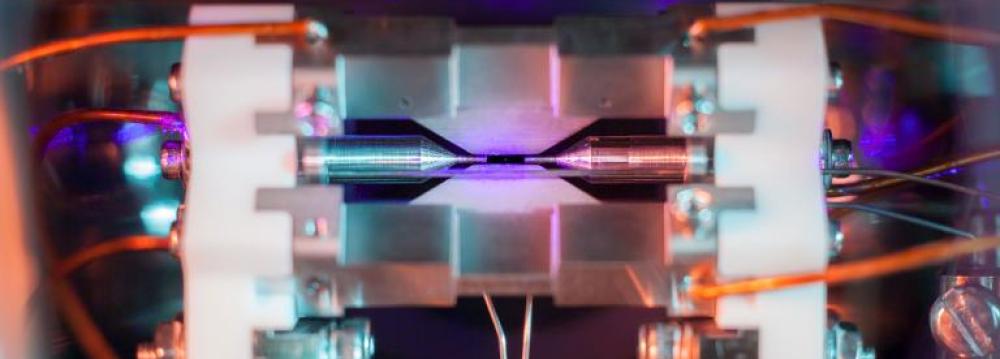 The atom’s place is being held by an electric field created by two metal electrodes. When illuminated with a blue-violet laser, as shown in the photo, the atom absorbed and reemits enough light to make it so an ordinary camera can capture it with a long exposure. For perspective on just how small this entire scene is, the distance between the ion and the electrode tips on either side is about two millimeters.