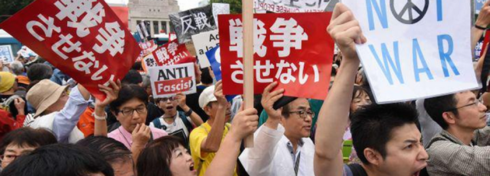 “No to war legislation,” ‘’Scrap the bills now” and “Abe, quit” were chanted in one of the biggest protests in recent memory in Tokyo in objection to the country’s military ambitions.