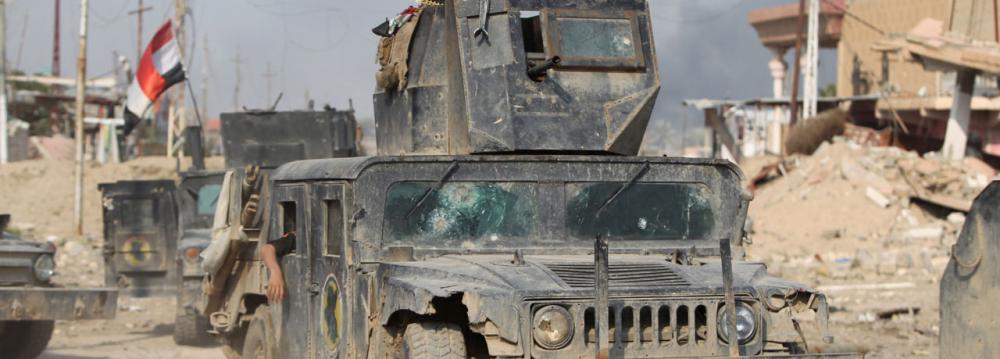 Arriving by helicopter in the shattered city west of Baghdad, Abadi traveled in a convoy of Humvees and met soldiers at the main government complex captured by counter-terrorism forces on Monday, where he planted the tricolor Iraqi flag.