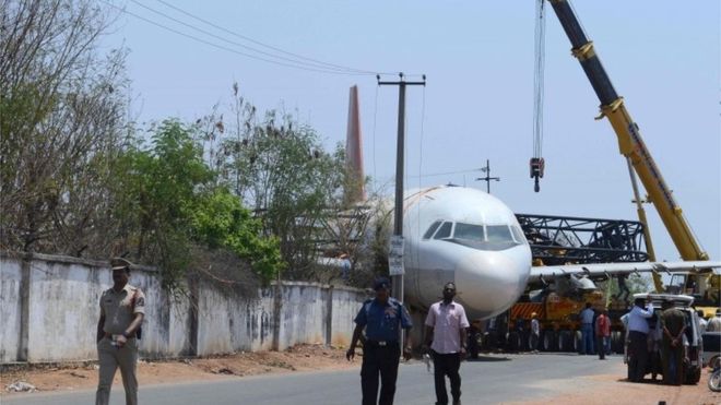 A disused airliner has fallen from a crane onto a wall in southern India. The Air India Airbus A320 was hoisted 20m above the ground while being moved at Begumpet Airport in Hyderabad to the company's nearby flight training center, BBC reported.
