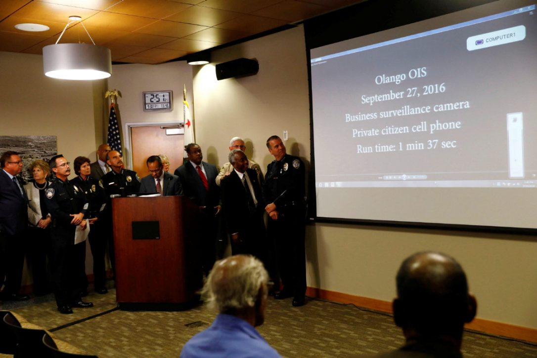 The newly released video footage came from a nearby surveillance camera and the cellphone of a bystander. In the phone video, a woman can be heard shouting at Olango to put up his hands and telling police not to shoot before at least four shots ring out.