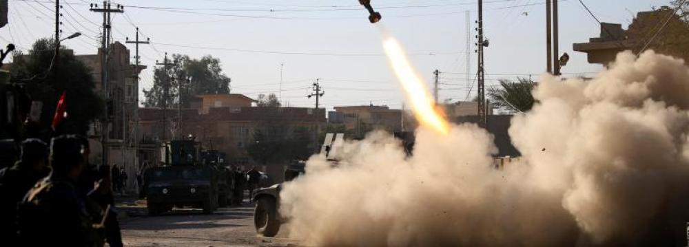 Caption: Members of the Iraqi rapid response forces fire missile toward IS militants during a battle in Somer District of eastern Mosul, Iraq.