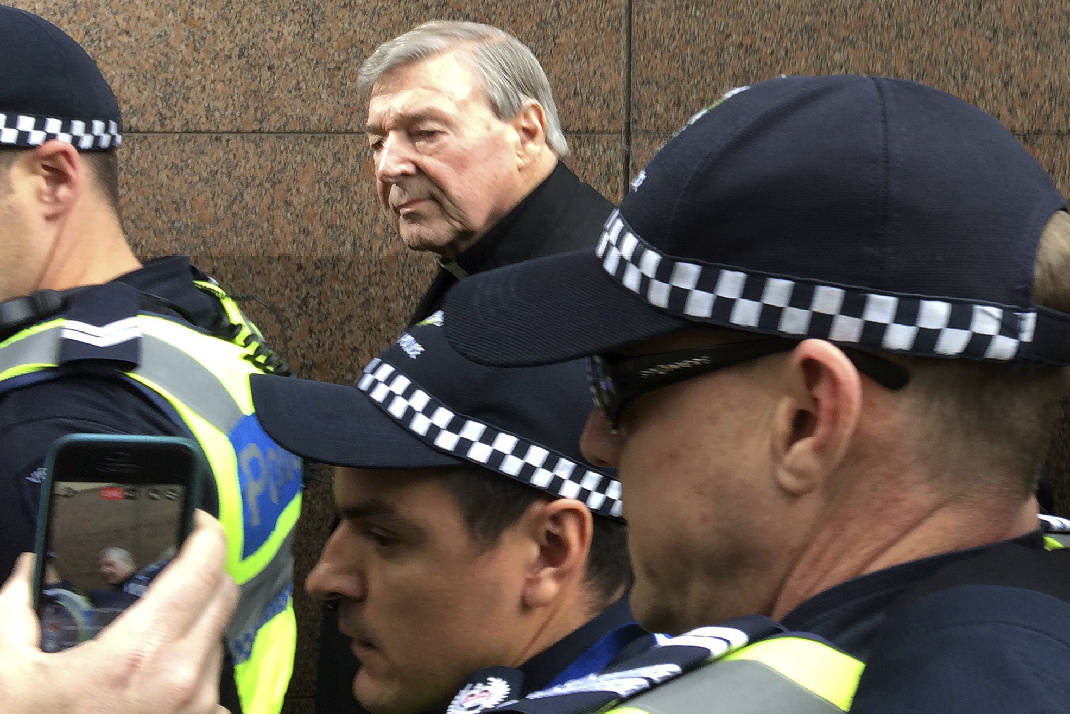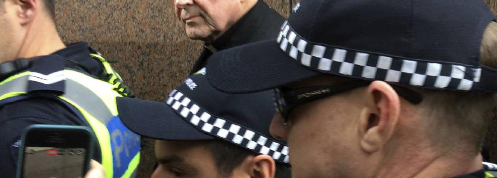 As Pell left the courthouse, a dozen Victoria police officers formed a protective circle around him, pushing their way through a media scrum as protesters shouted at the cardinal.