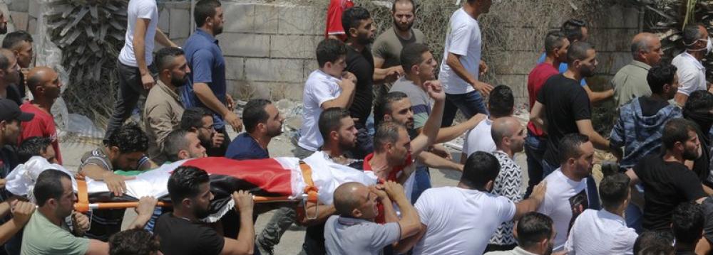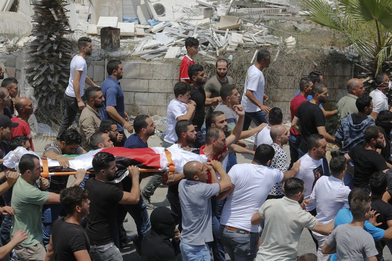 CAPTION: Palestinians carry the body of a young man killed by Israeli army during his funeral in the West Bank village of Beit Ummar on July 14.