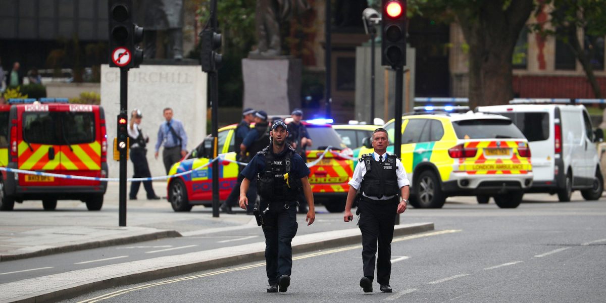 Later images showed police holding the man, dressed in jeans and a black puffer jacket, in handcuffs as roads and Underground stations around parliament were sealed off.