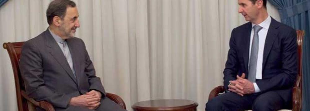 Syrian President Bashar al-Assad expressed gratitude to the Leader of the Islamic Revolution and Iranian officials and people for their support for the Syrian nation.  Assad made the remarks in a meeting with Ali Akbar Velayati, senior adviser to the Leader on international affairs, in Damascus on Tuesday, IRNA reported.  He said, “The axis of resistance has taken shape and no one can break it, and undoubtedly we will emerge victorious.” So far the backing by Saudi Arabia, Turkey and some other countries for terrorists has failed to defeat the resistance, and God willing we will witness more victories.”  In addition, he said, “Of course, if it had not been for the Islamic Republic of Iran’s support, such gains could have not been achieved.”  Velayati, for his part, stressed that the Islamic Republic will always stand by the Syrian government and people.