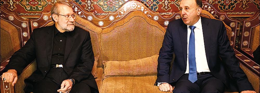 Majlis Speaker Ali Larijani held talks with Syrian President Bashar al-Assad, Parliament Speaker Mohammad Jihad al-Laham and Prime Minister Wael al-Halqi in Damascus on Sunday.