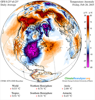 Temperatures across the Great Lakes and Eastern United States are setting cold temperature records for the first half of February, 2015, according to the Northeast Regional Climate Center. Compared to expected temperatures, it is the coldest region of the planet.