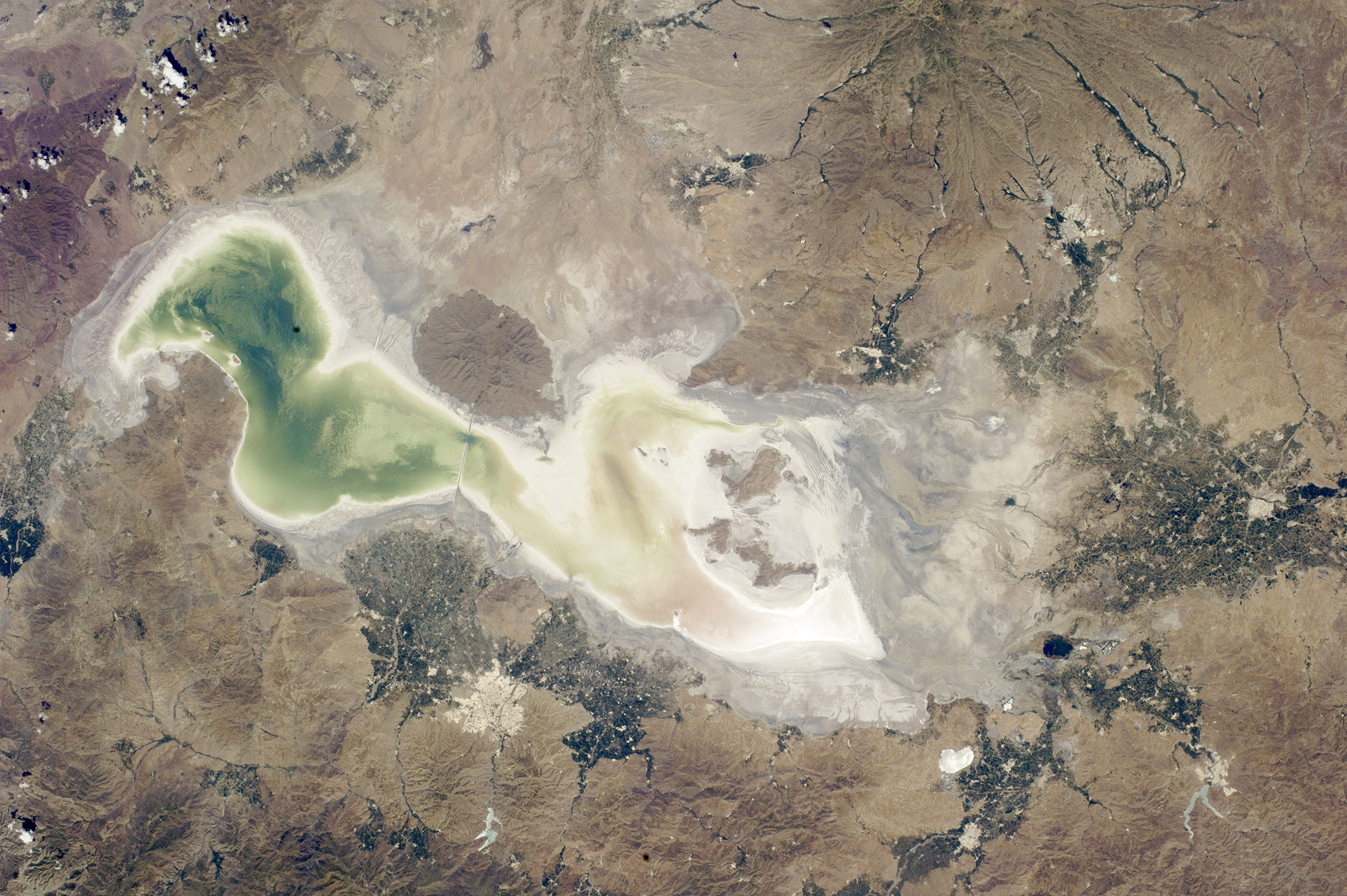 In addition to Iran’s perennial battle with drought, the lake has dried up drastically due to a host of other factors, including the construction of a 15-kilometer causeway to shorten the travel time between Urmia and Tabriz cities, as well as the construction of several dams that have choked off water supply from the mountains towering on either side of the lake.