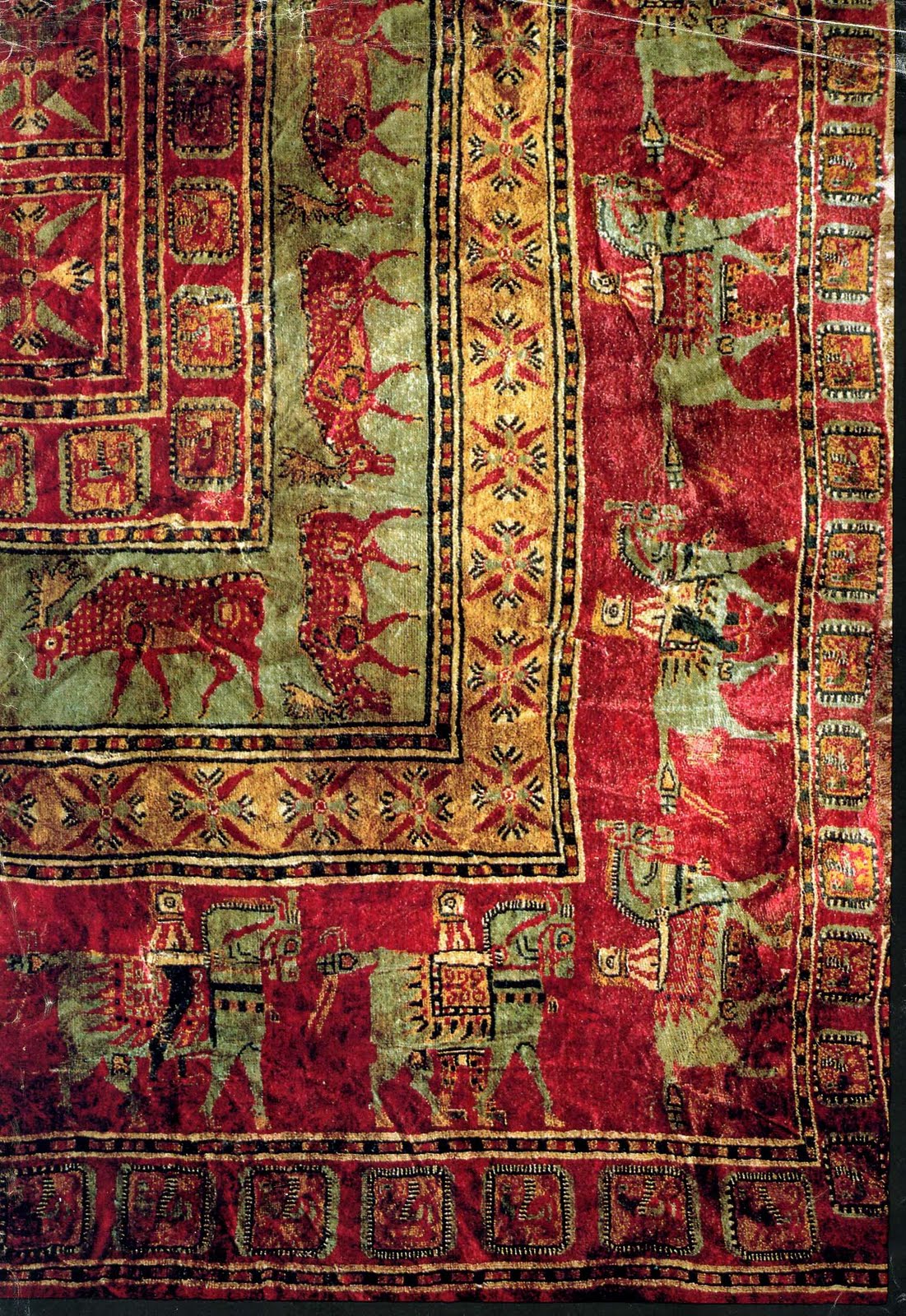 The Pazyryk rug is knotted tufted wool with live colors of dark red, green, blue, yellow, and light orange colors, about 2 sq. m. in dimension.