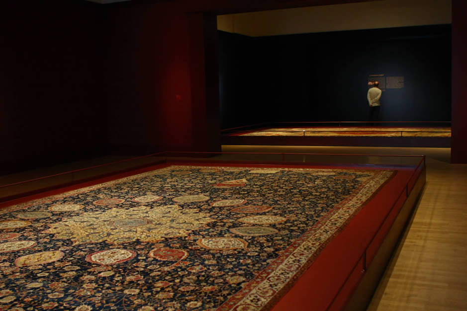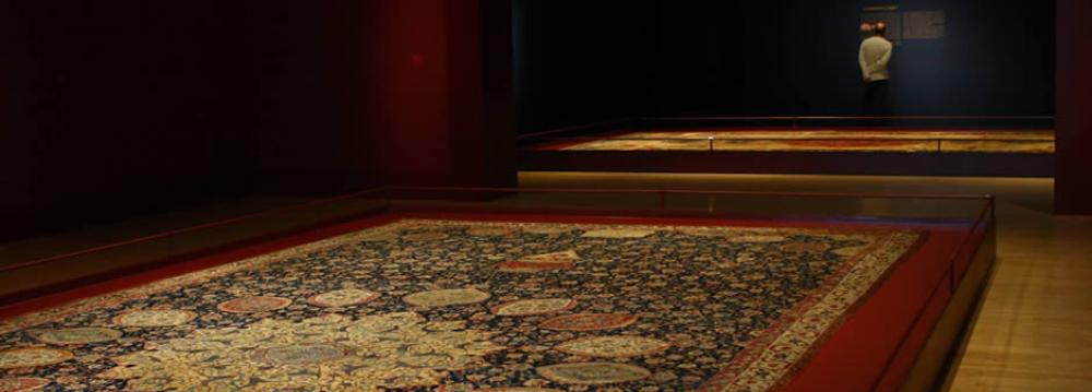 on the ground floor across 1500 sq meters, 150 carpets are on permanent display There are carpets from Kashan, Kerman, Isfahan, Tabriz, Khorasan, Kurdistan, among others. Carpet weaving tools and materials are also on display. Chairs at regular distances invite the visitors to sit and enjoy watching the masterpieces of patient artisans of the past.