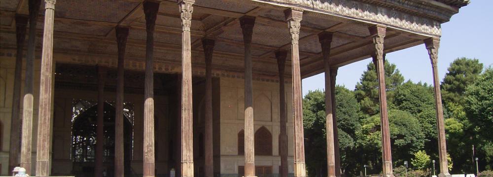 The entrance pavilion is a special feature of the building. It is supported by twenty slender wooden columns which, when reflected in the waters of the fountain, appear to be forty. This has inspired the name Chehel Sotoun which means forty columns in Persian.