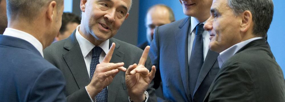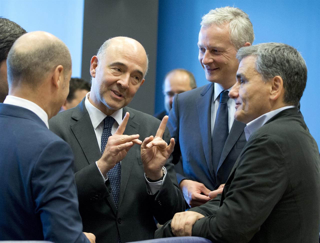 Greek FM Euclid Tsakalotos (R) speaks with the EC’s Pierre Moscovici (2nd L) during a meeting of eurogroup finance ministers at EU headquarters in Luxembourg, on Thursday.