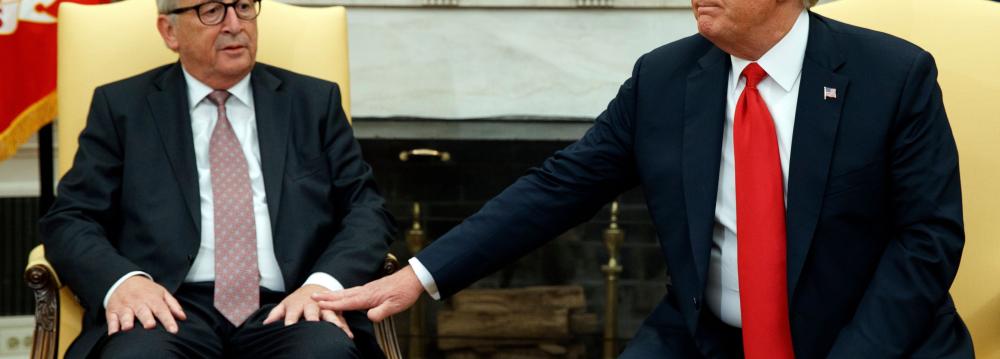 Donald Trump (R) and Jean-Claude Juncker agreed to put the EU-US trade war on hold at the their meeting in the Oval Office on Wednesday.