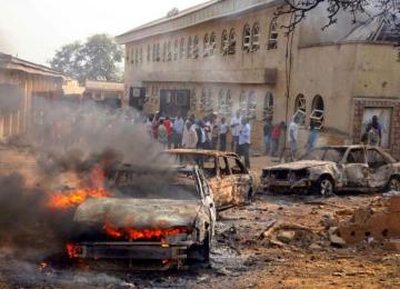 Two female suicide bombers struck a crowded market in north-east Nigeria on Sunday, killing at least four people and injuring dozens.