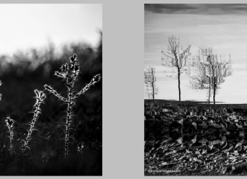 A display of 16 digital color and black-and-white photos in eight pairs of “urban…